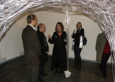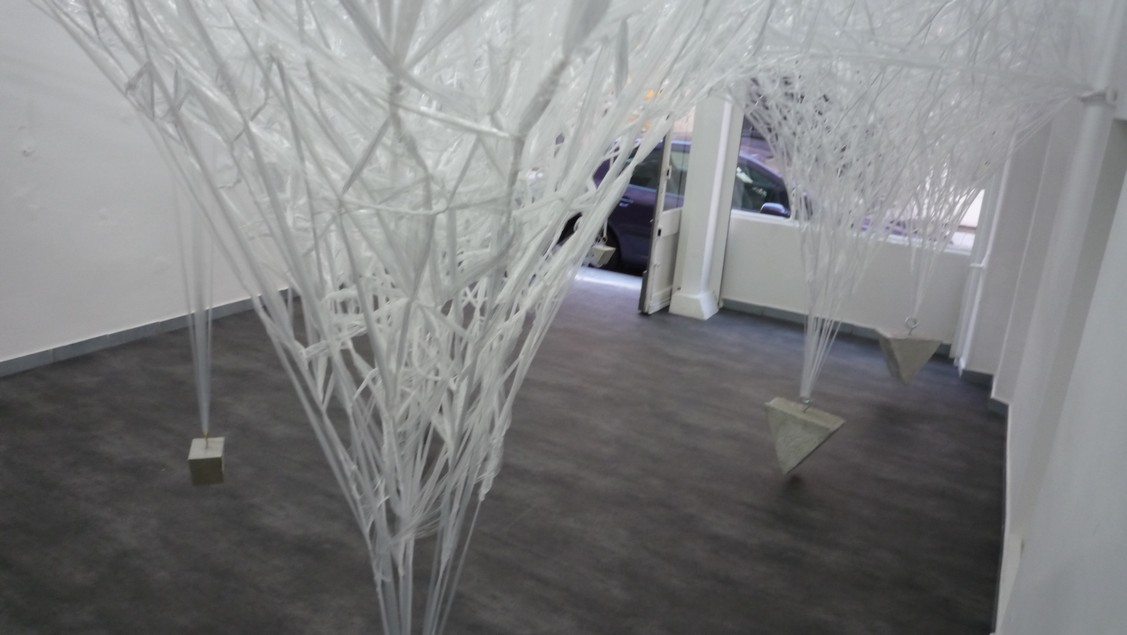 The Galerie Roi Doré presents the exhibition “Space Crystallization” by Ludwika Ogorzelec, offering a selection of the artist’s drawings and sculptures, both from the “Instruments of equilibrium” series and from her most famous series, called the “Space crystallization”. As is the most often with the sculptures from this series, the artist created for the exhibition the work in situ, forming it from repeatedly intersecting lines that mark the edges of the three-dimensional space (hence the name of the series). Indeed, the material of Ogorzelec’ sculptures is the space itself and the lines of wood, metal or glass are only a contour of the “space crystallization”.